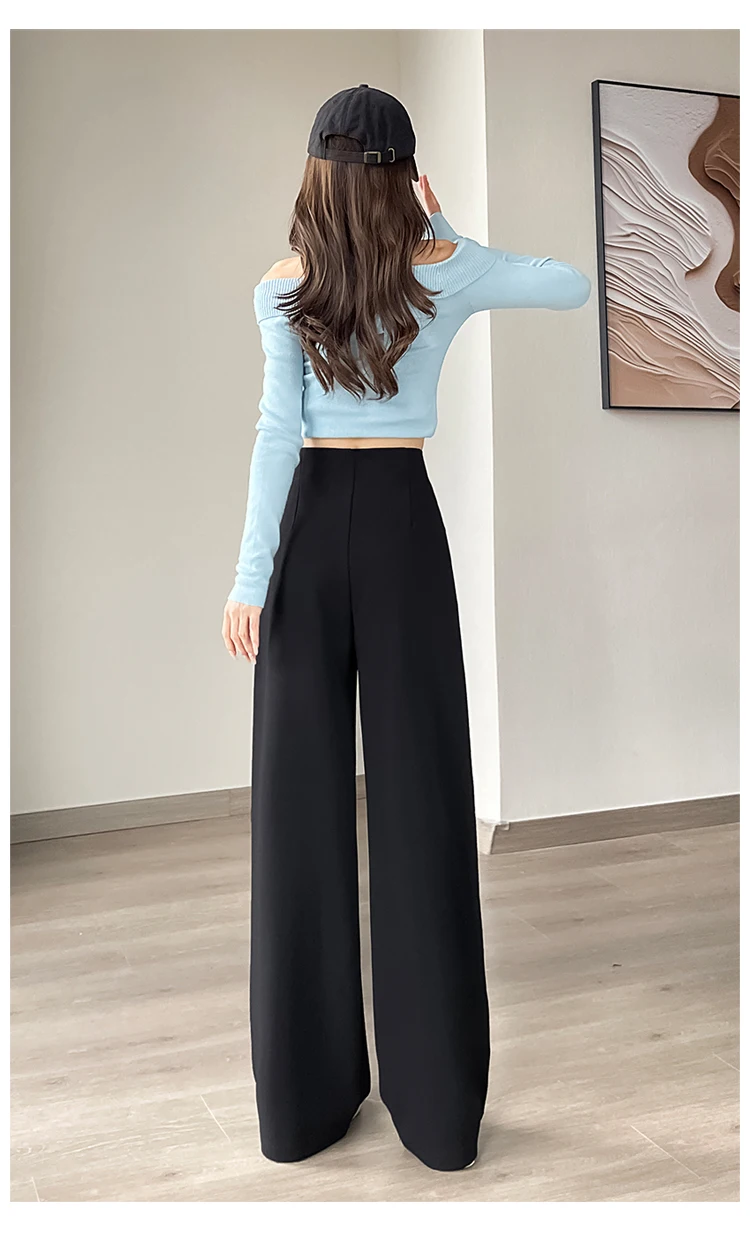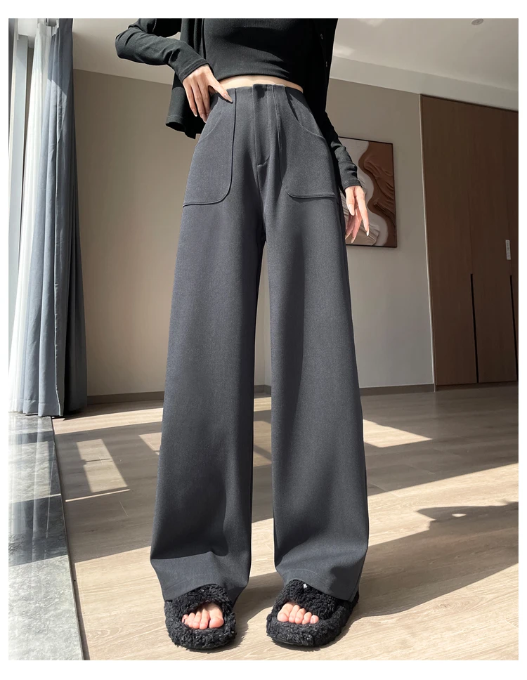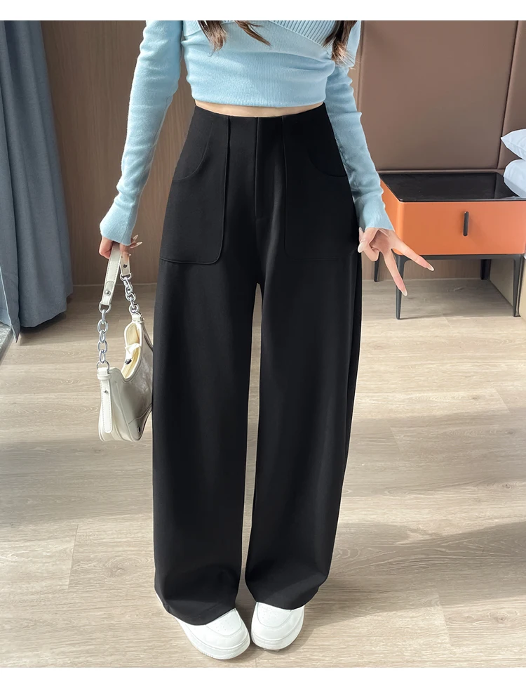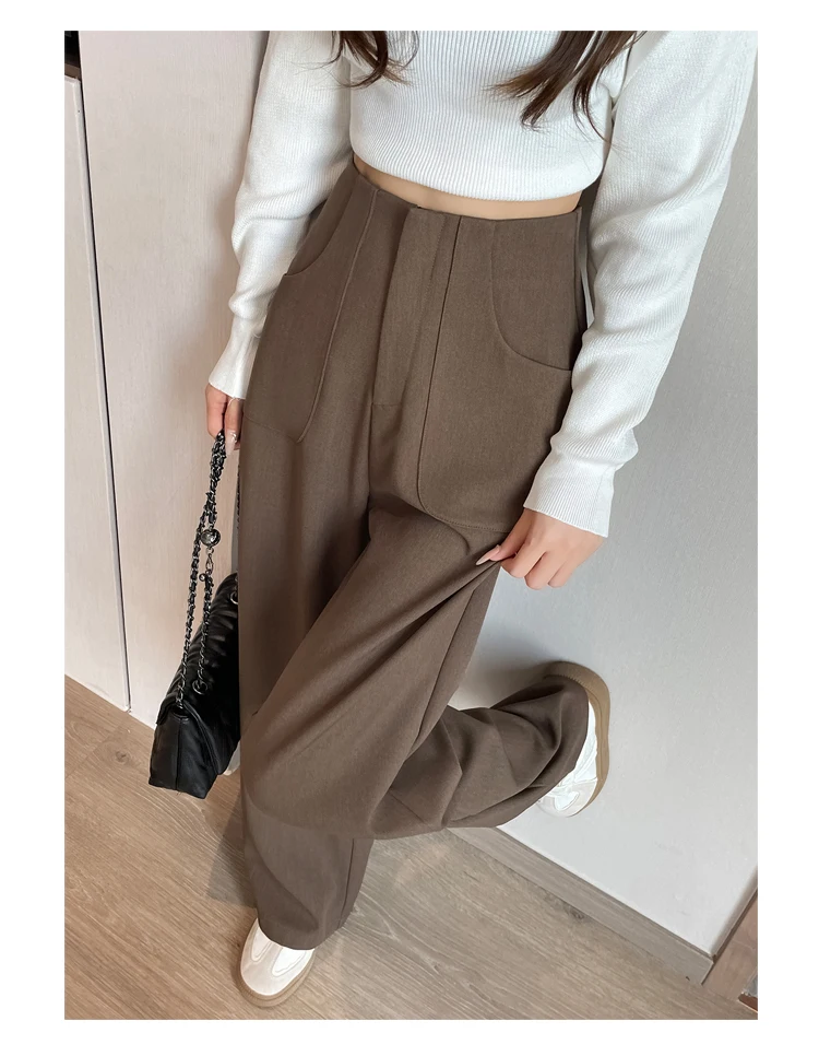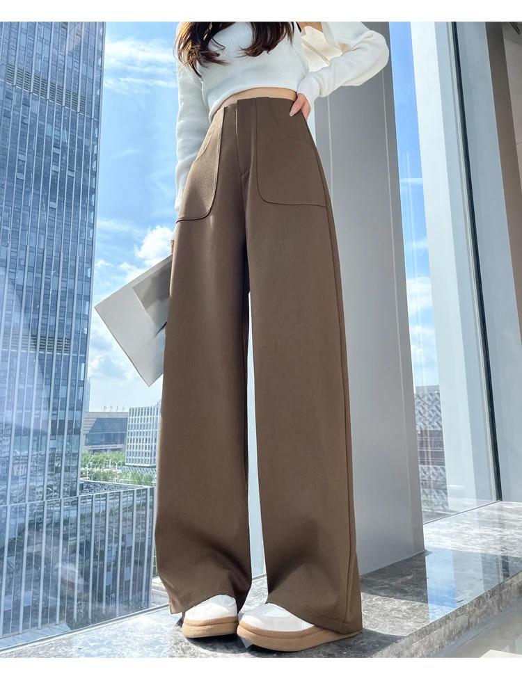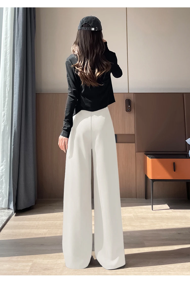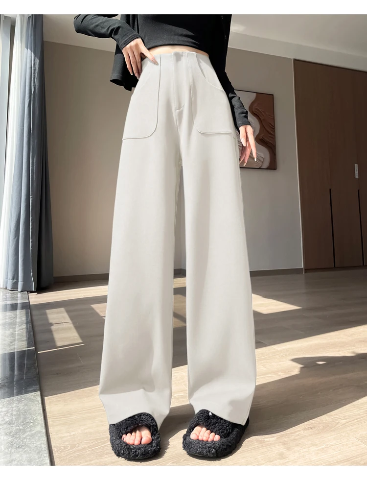 2025 New Spring Summer White Pockets Wide Leg Pants for Women Elegant Solid Office Lady Korean Women's Casual Loose Pants Female