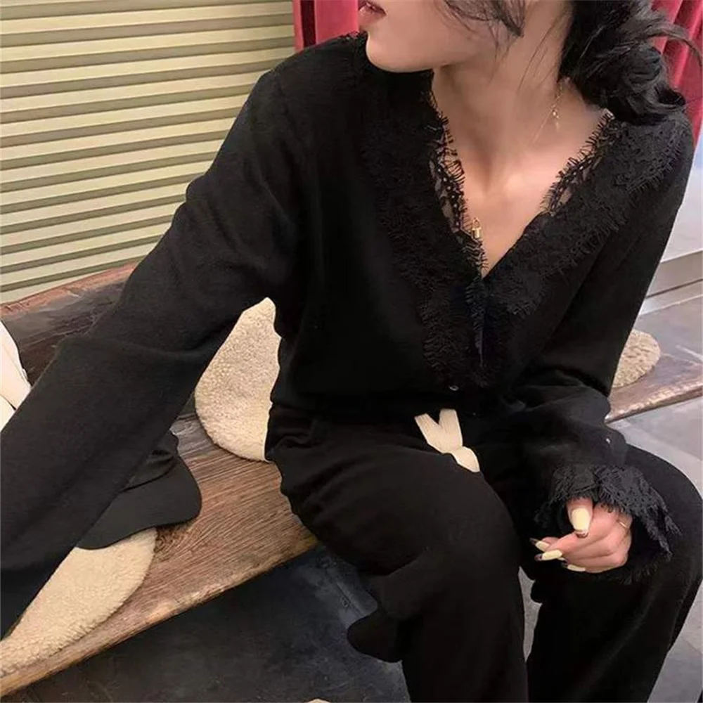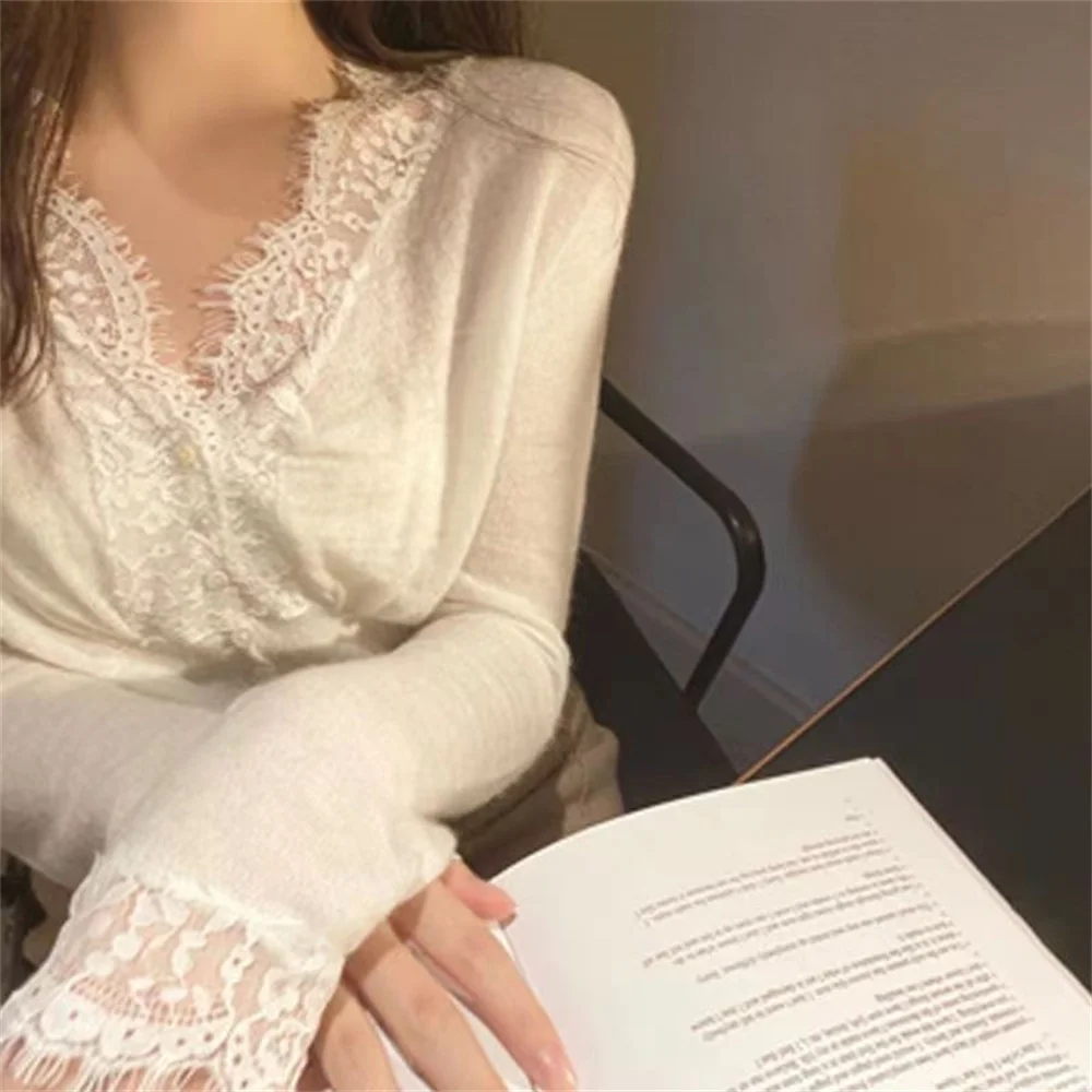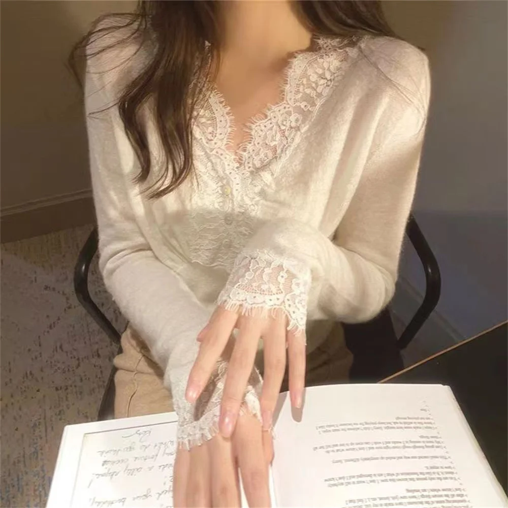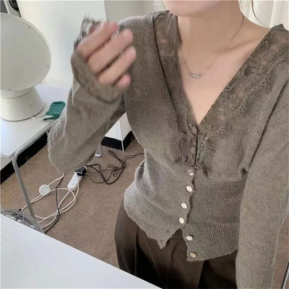 2026 Elegant Lace Cropped Cardigan Women Korean Spring Fashion V-neck Knitted Sweater clothes Slim Basic Tops Autumn Winter