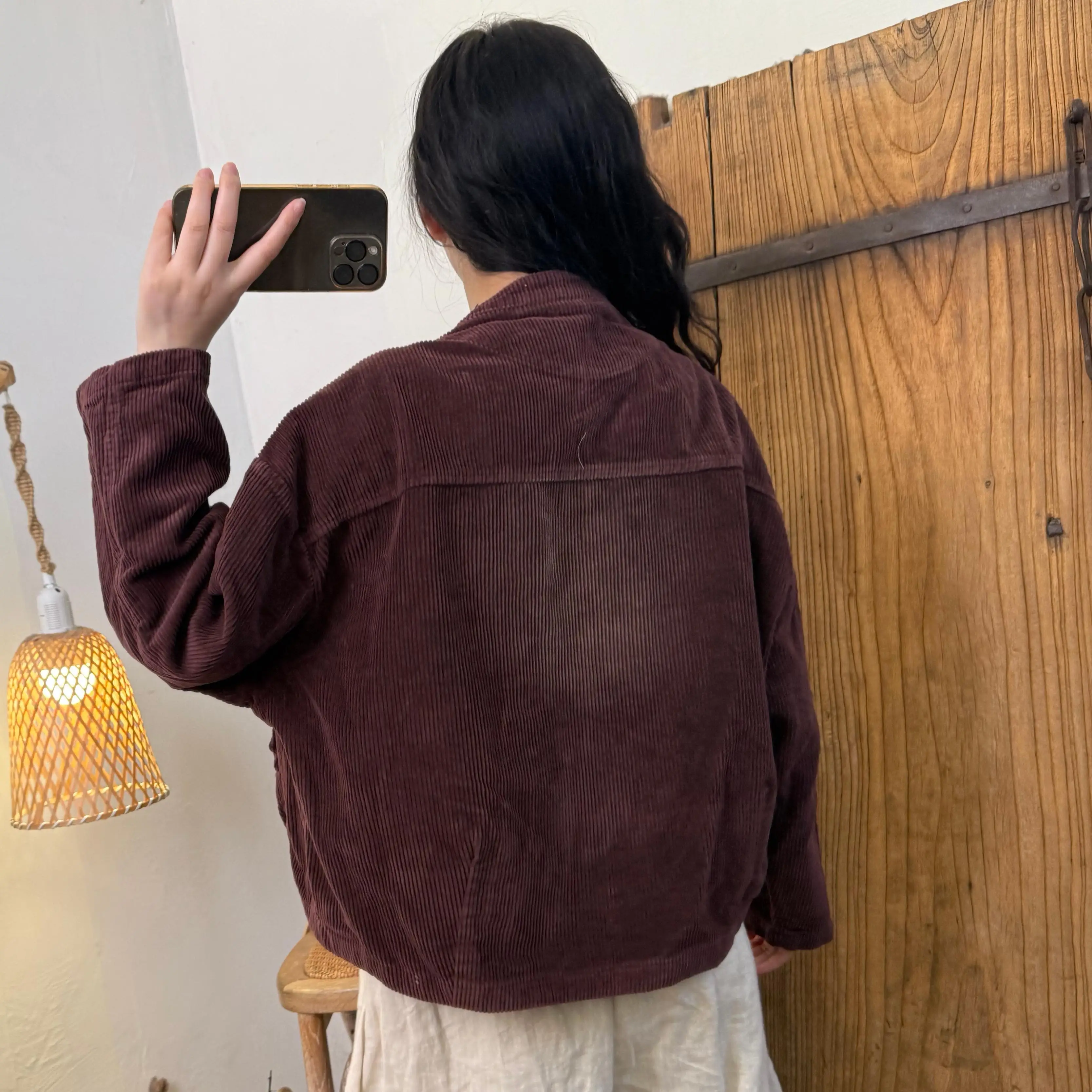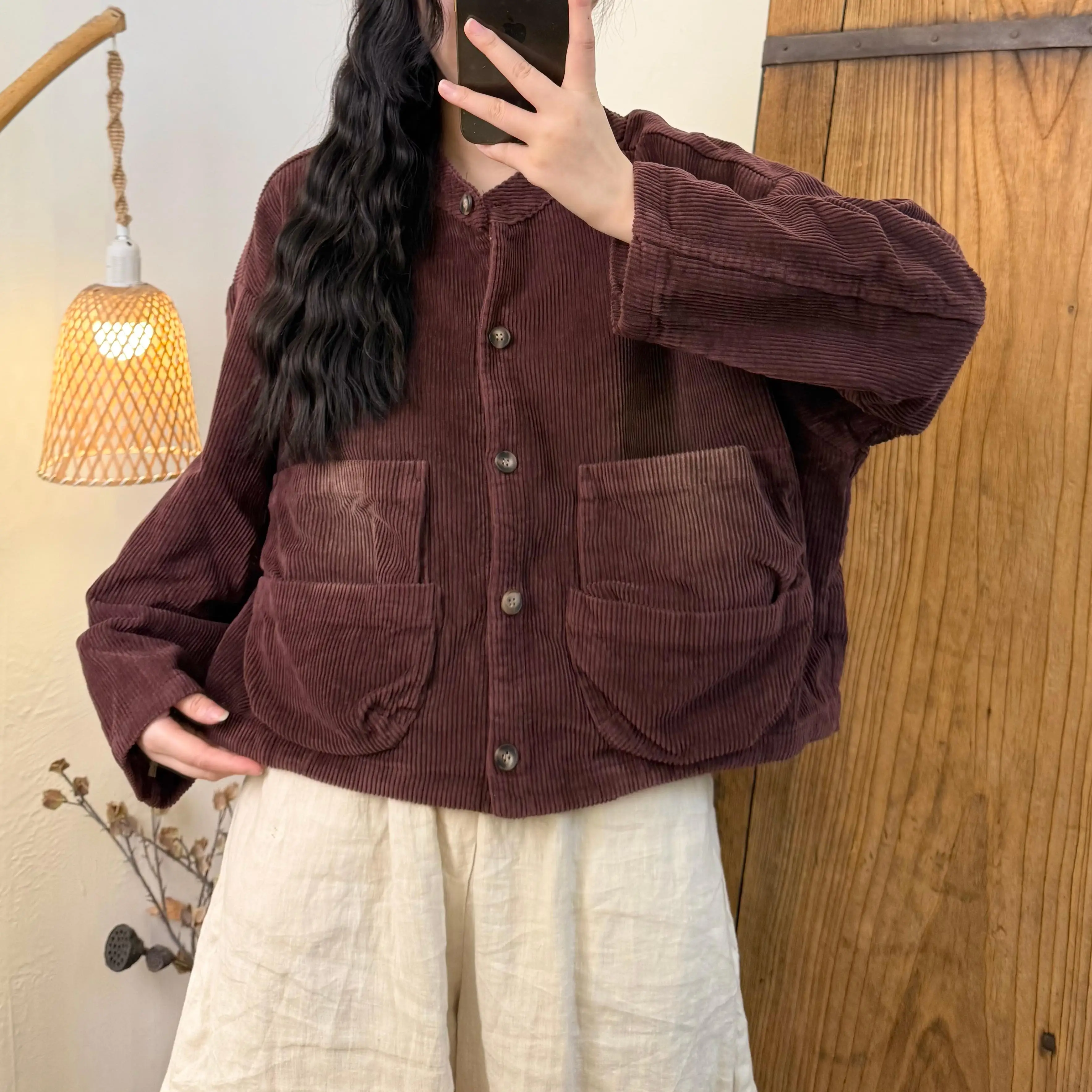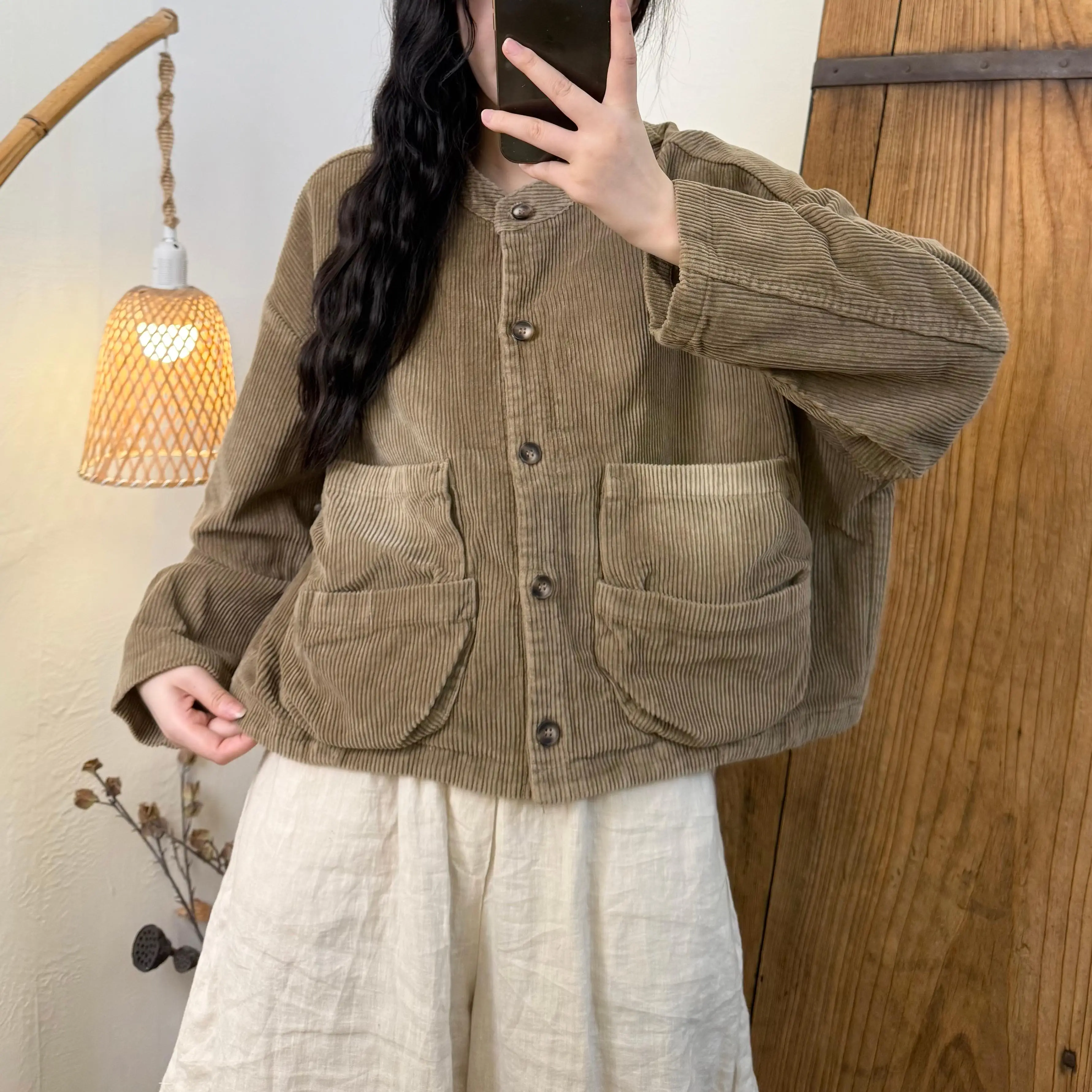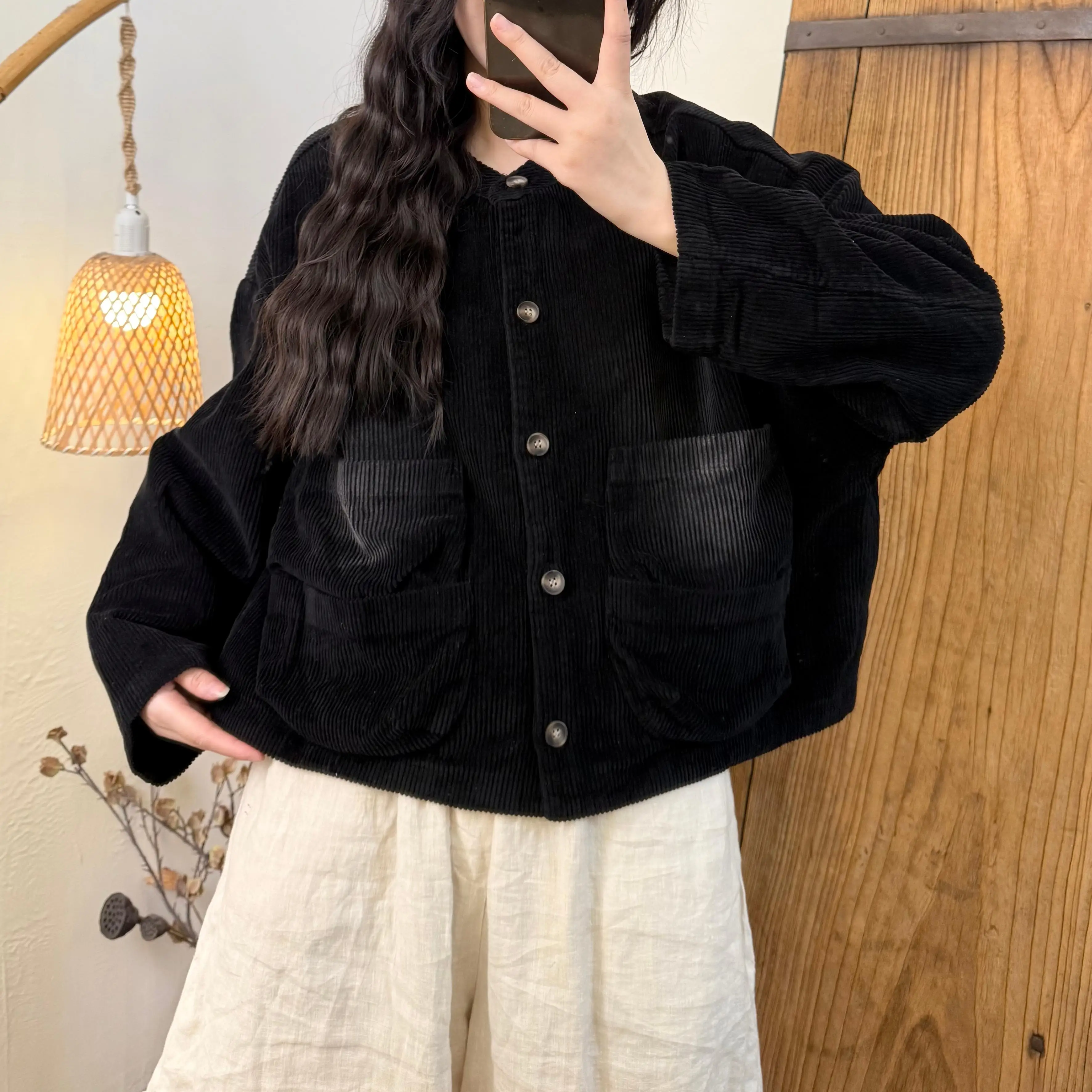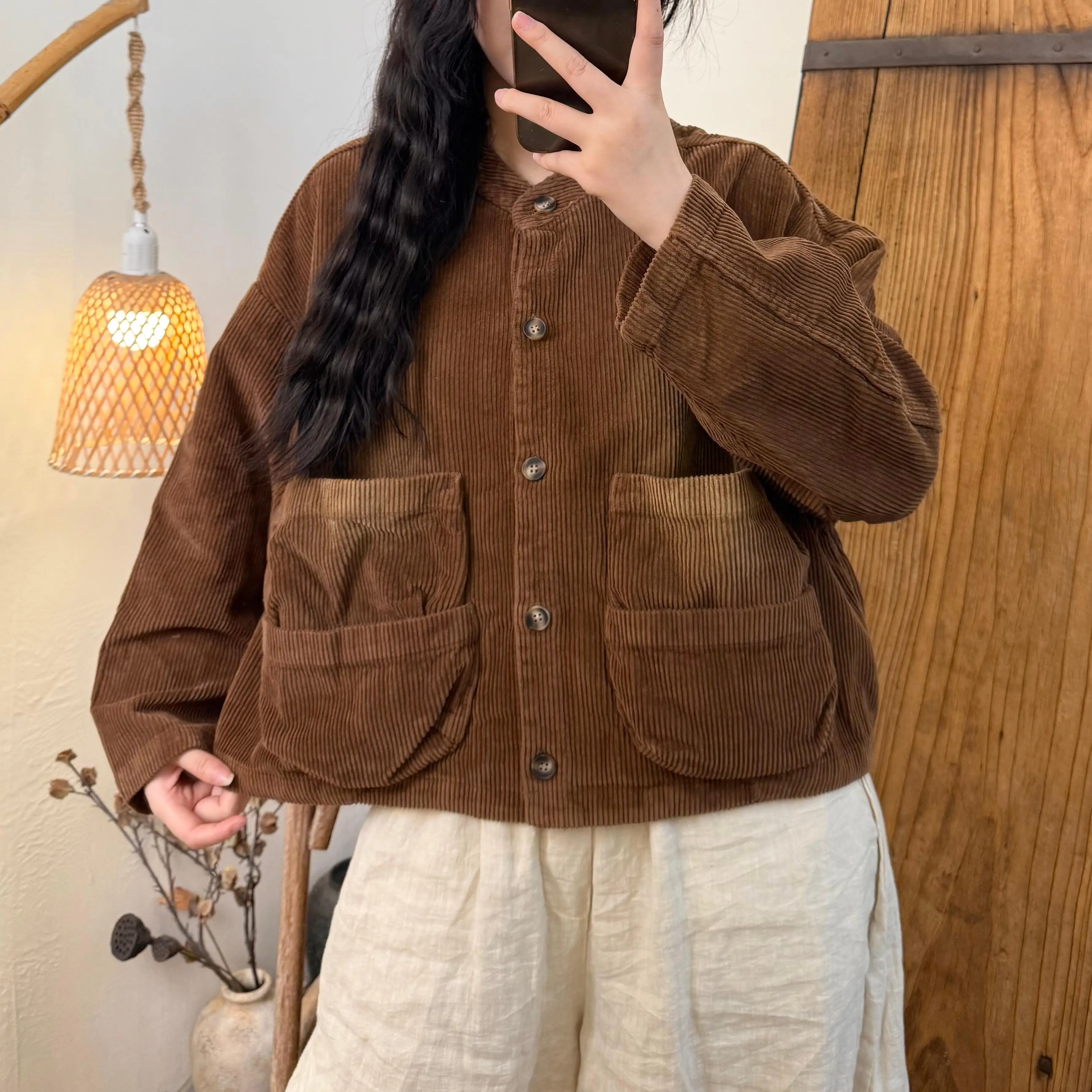 Autumn Arts Style Women Long Sleeve Single Breasted Big Pocket Short Coats High Quality Cotton Corduroy Loose Casual Jackets