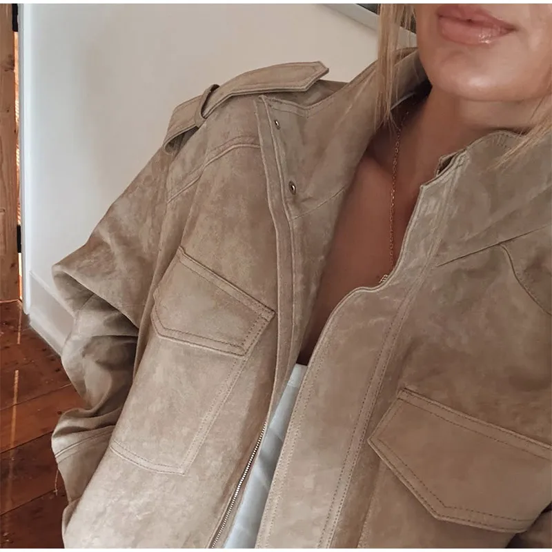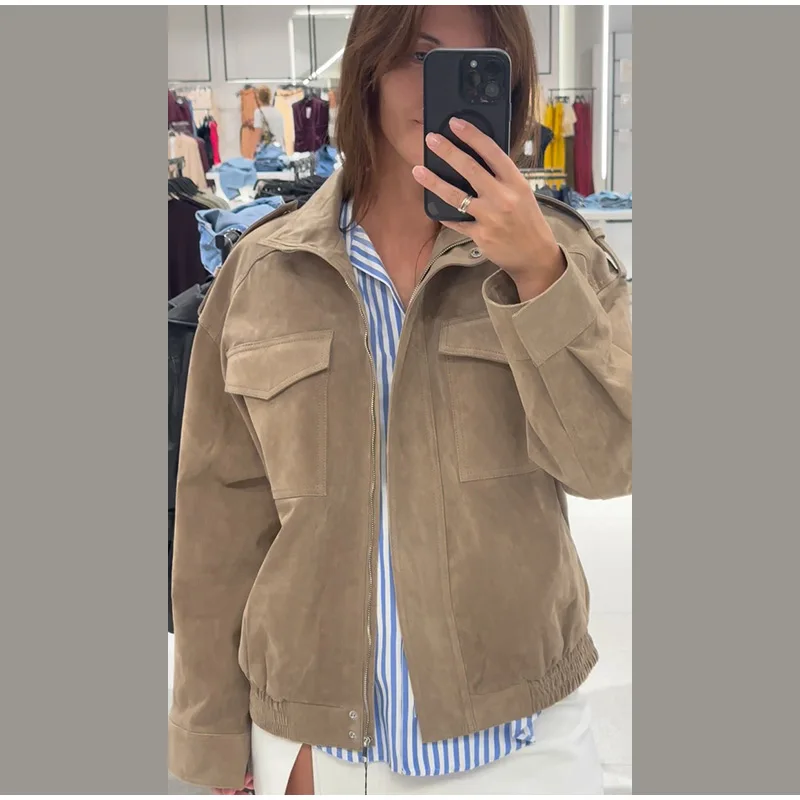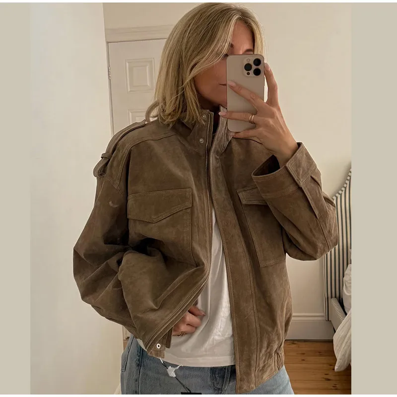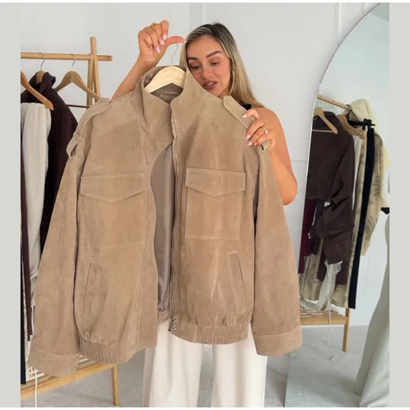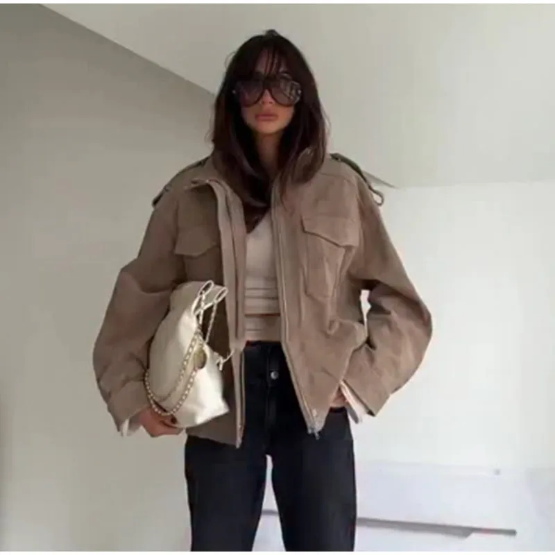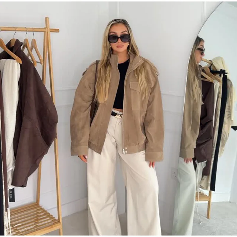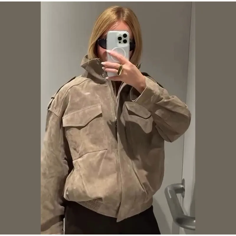 Fashion Stand Collar Suede Jacket Women Long Sleeve Pockets Zipper Loose Bomber Jacket 2025 Autumn Lady High Street Outwear