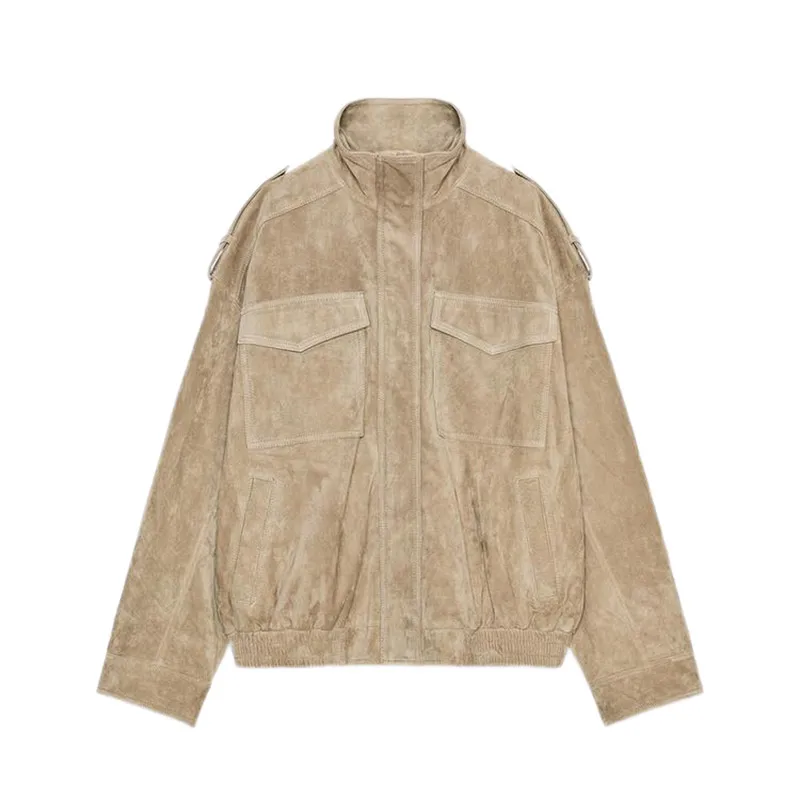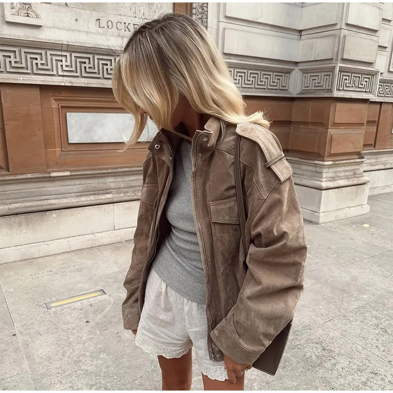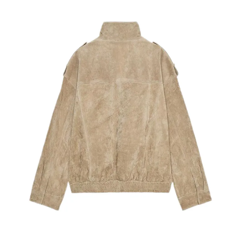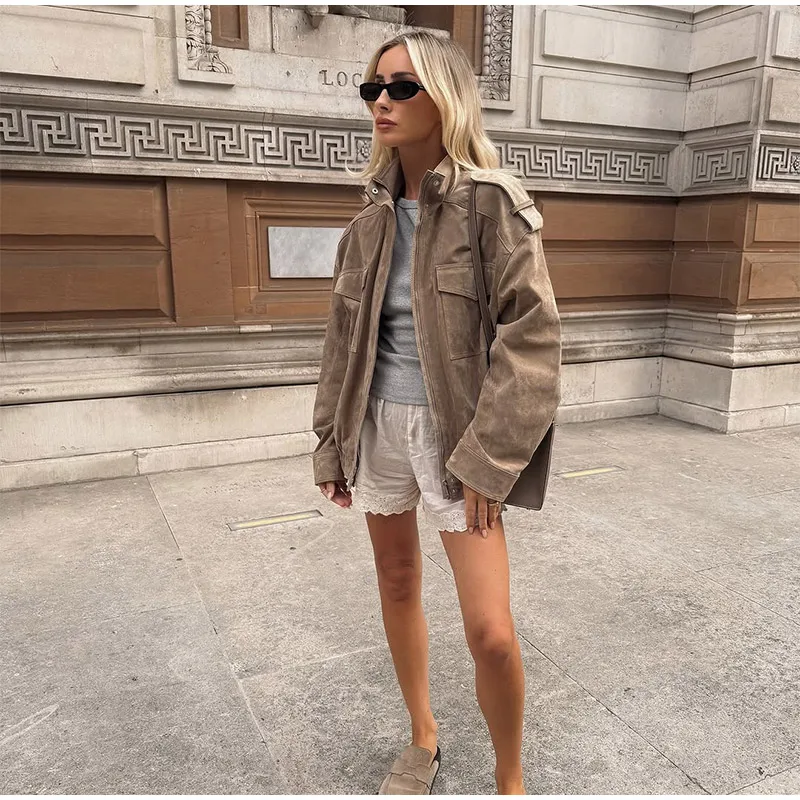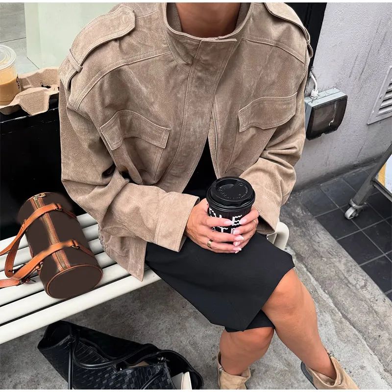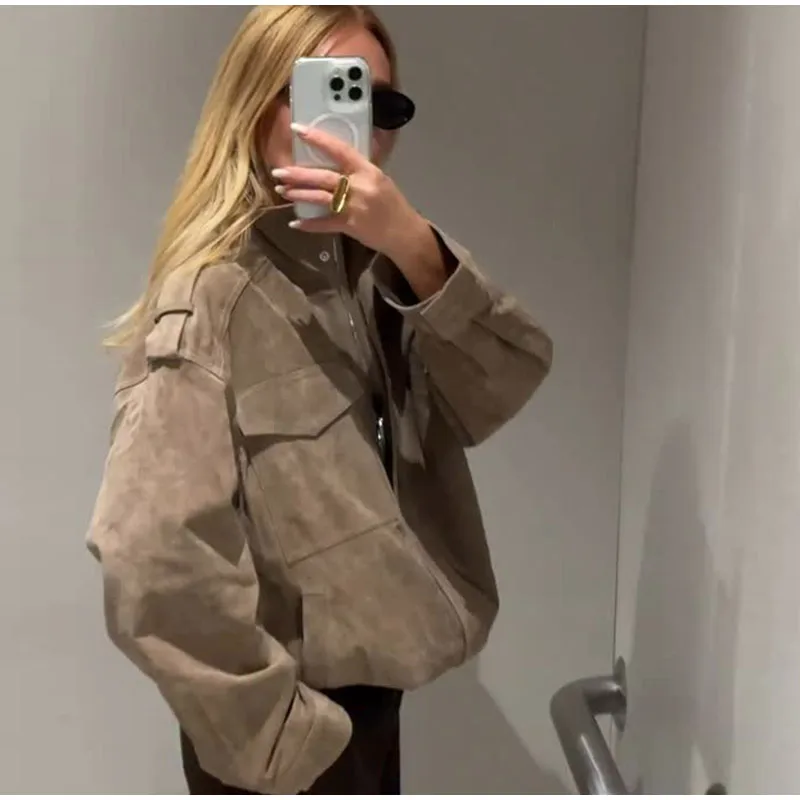 Fashion Stand Collar Suede Jacket Women Long Sleeve Pockets Zipper Loose Bomber Jacket 2025 Autumn Lady High Street Outwear