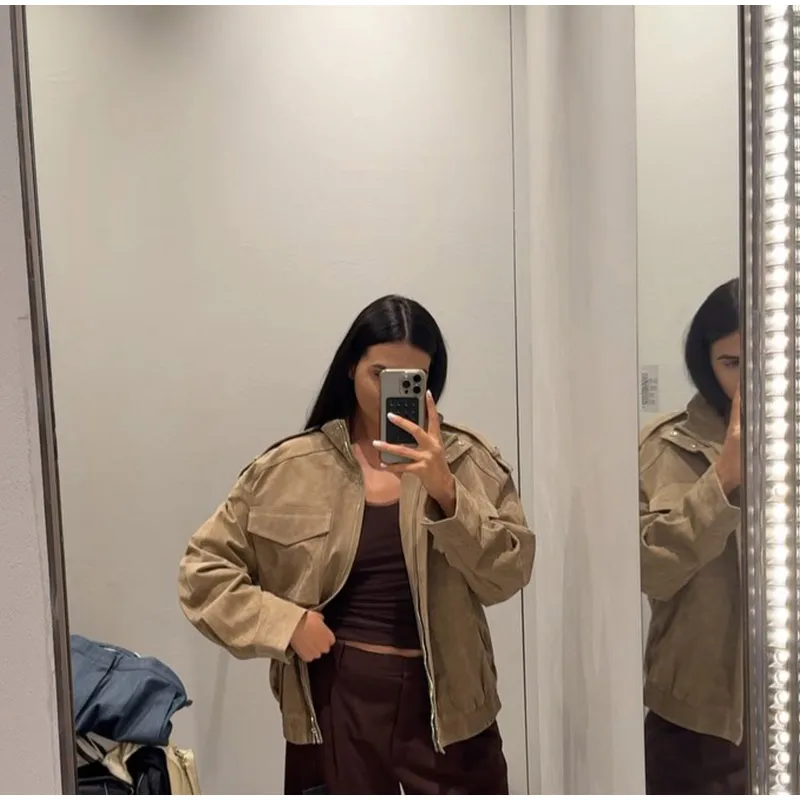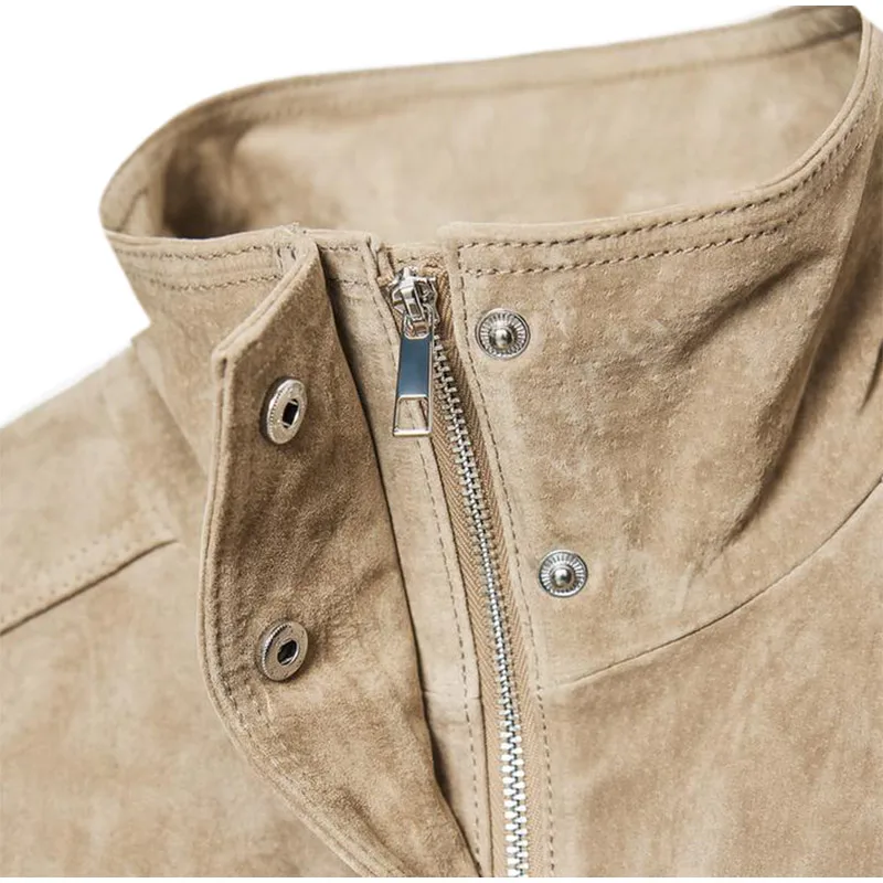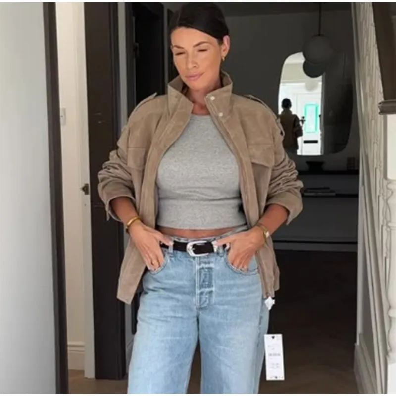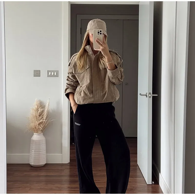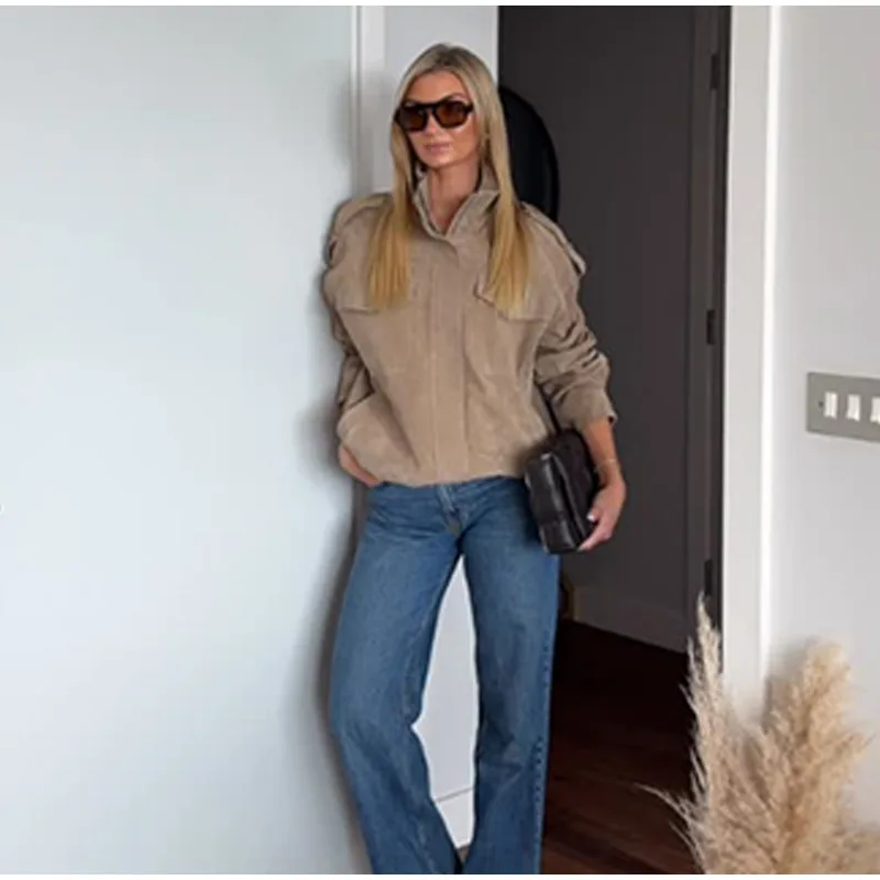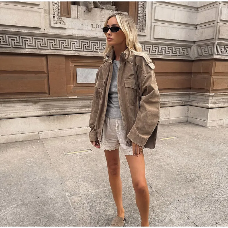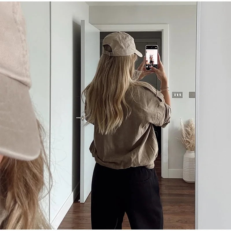Fashion Stand Collar Suede Jacket Women Long Sleeve Pockets Zipper Loose Bomber Jacket 2025 Autumn Lady High Street Outwear