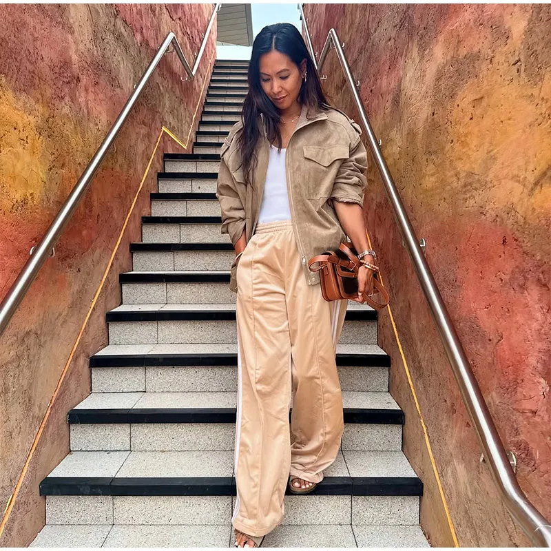 Featuring a chic stand collar and zipper pockets, it's a stylish addition to any autumn wardrobe.