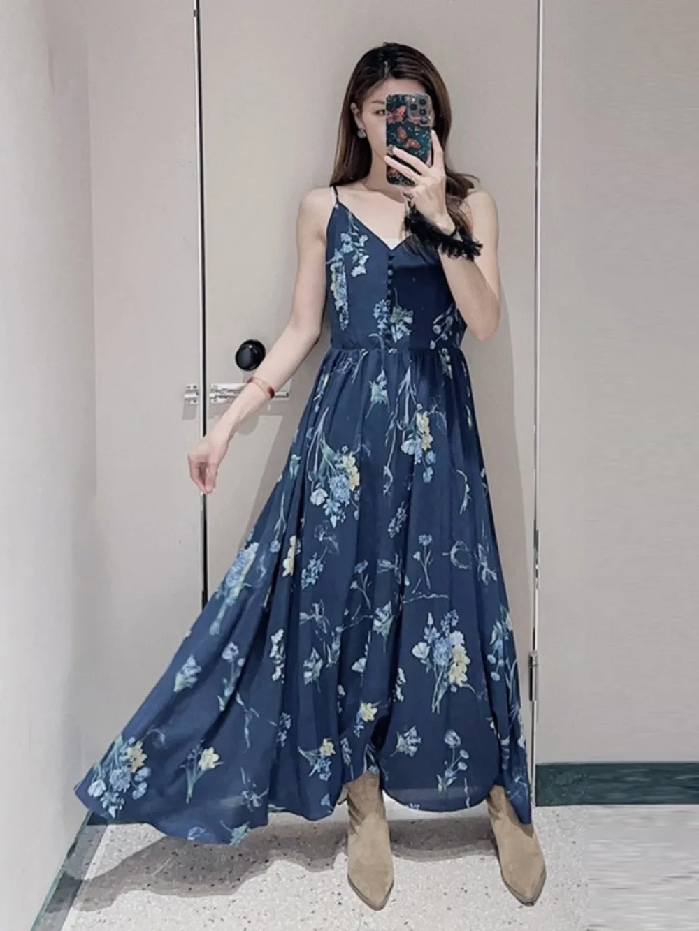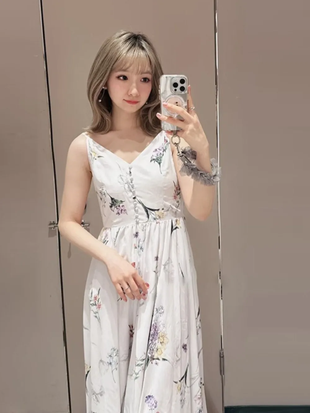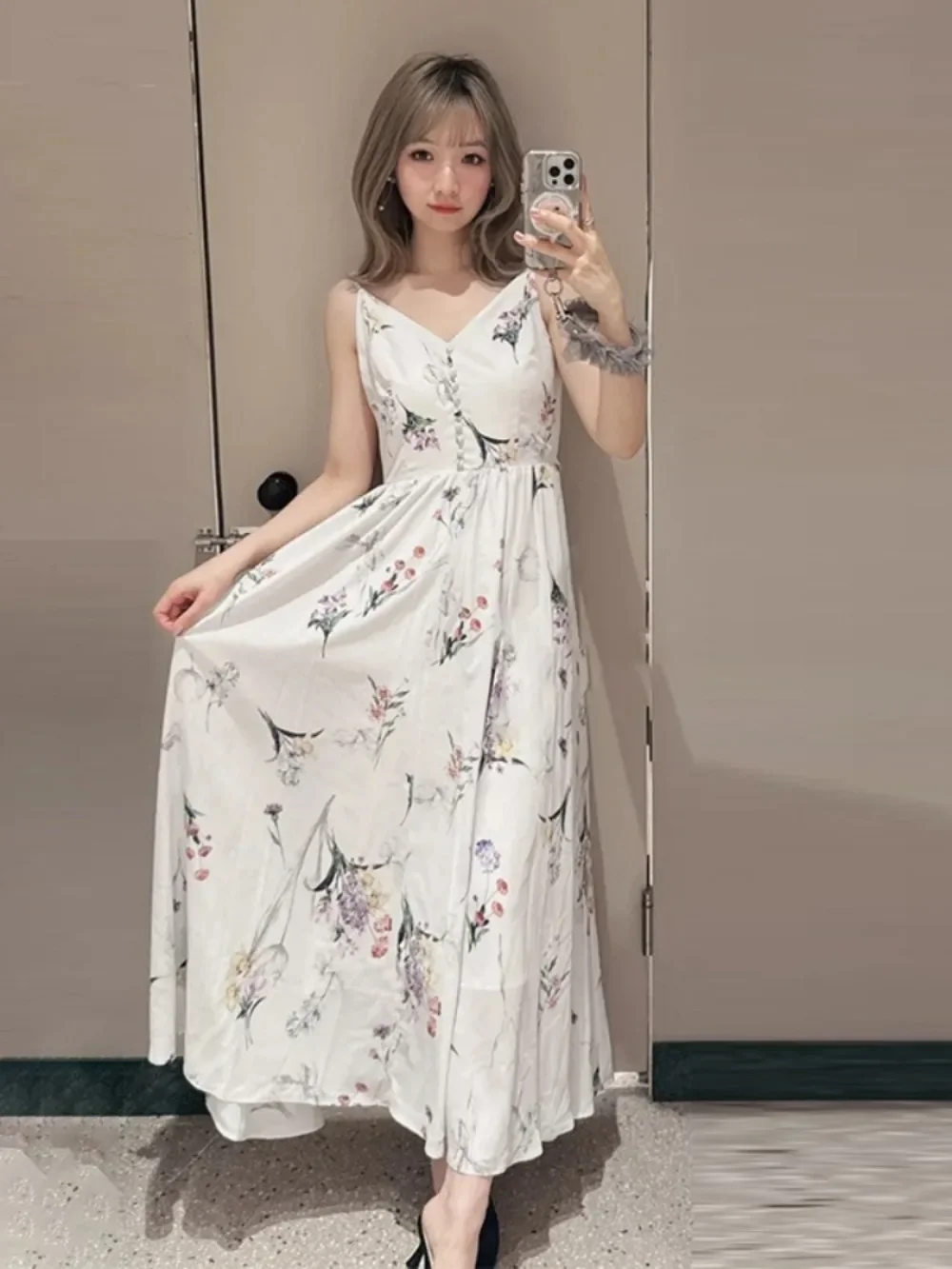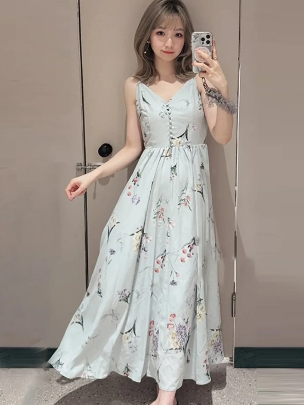 High Street Fresh Mid-length Big Swing Vestido Japan Pullover Ruched Dresses Sweet Print V Neck Slim Waist Sling Robe