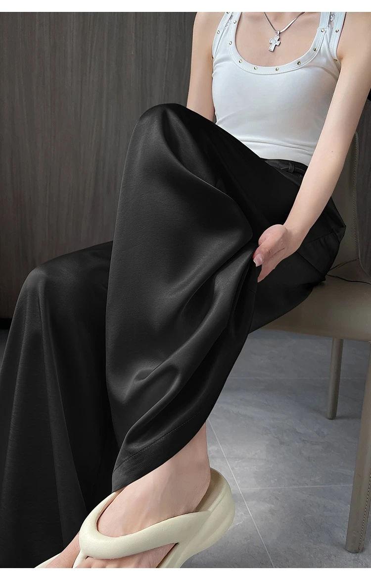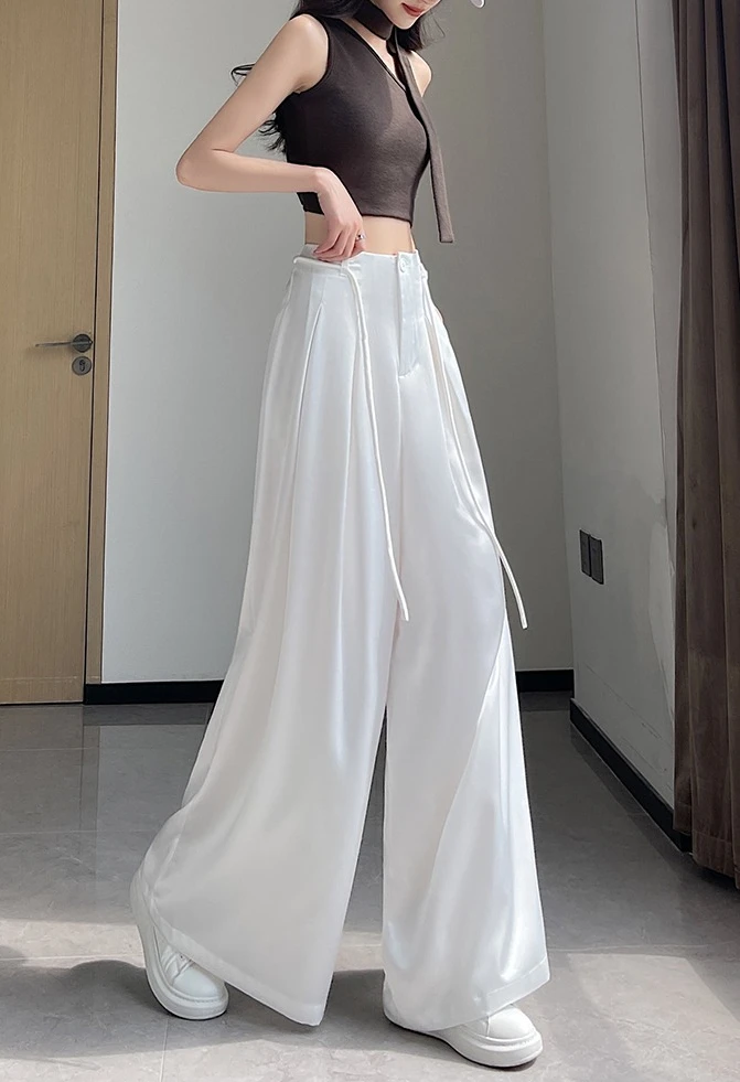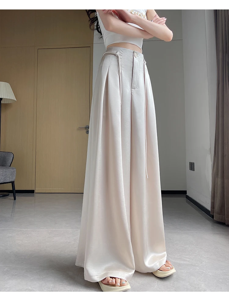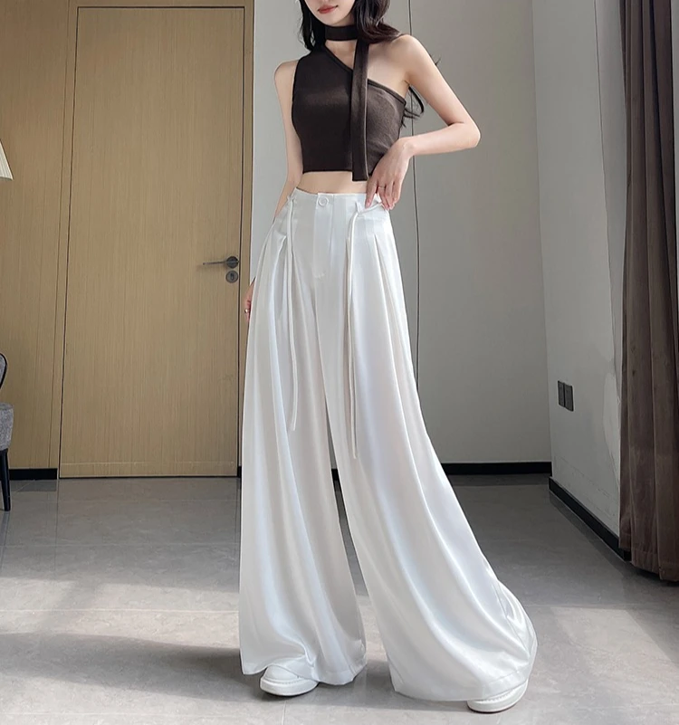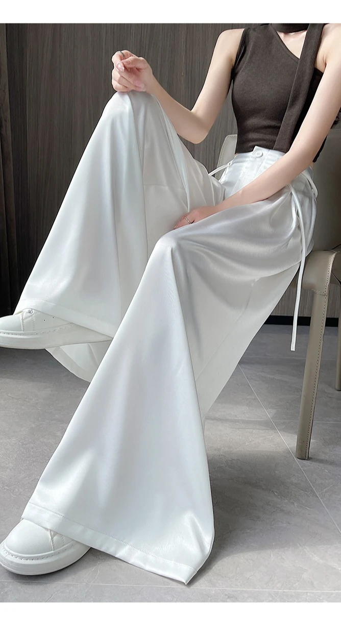 High Waist Elegant Satin Women's Wide Leg Full Length Pants 2025 New Solid Lace-up Autumn High Waist Casual Loose Trouser Female