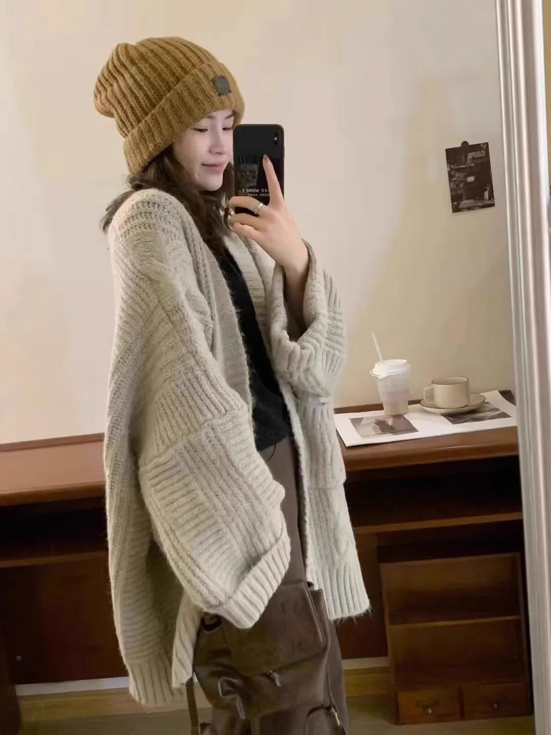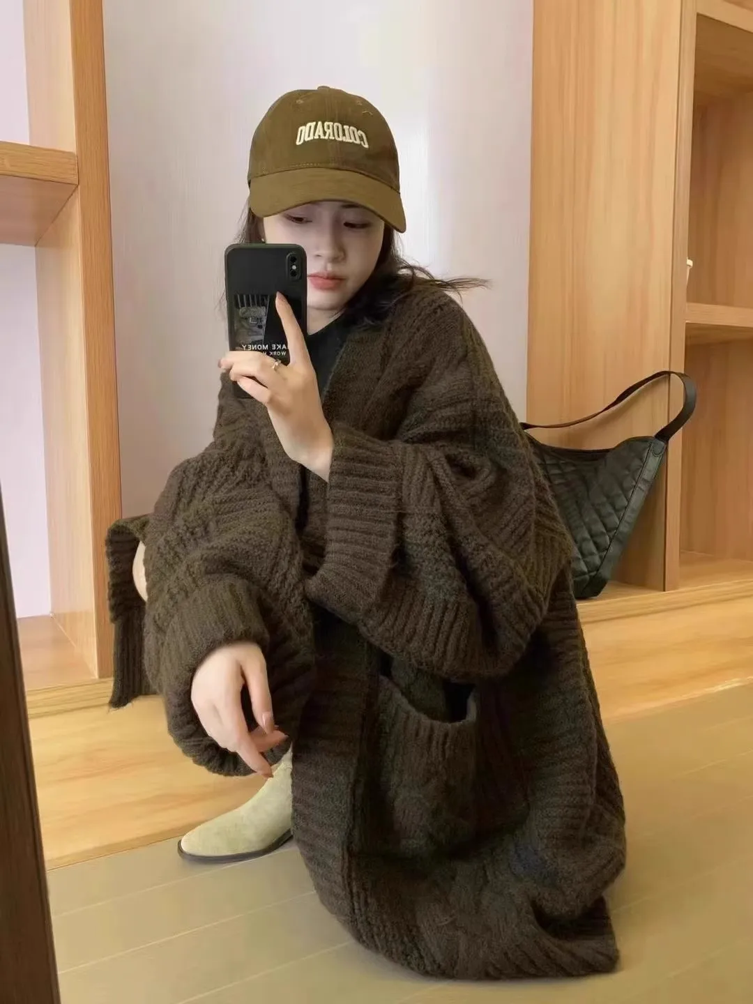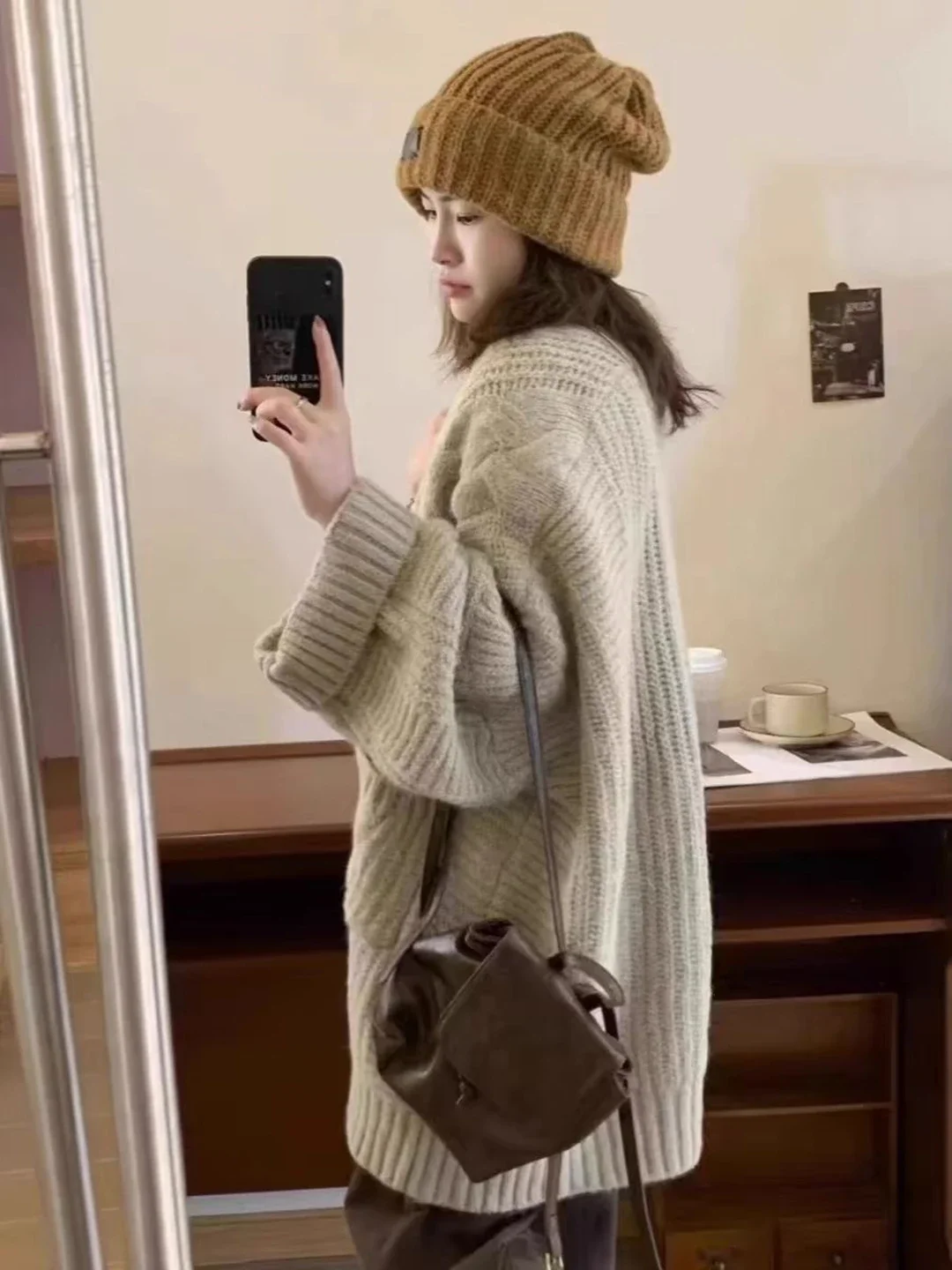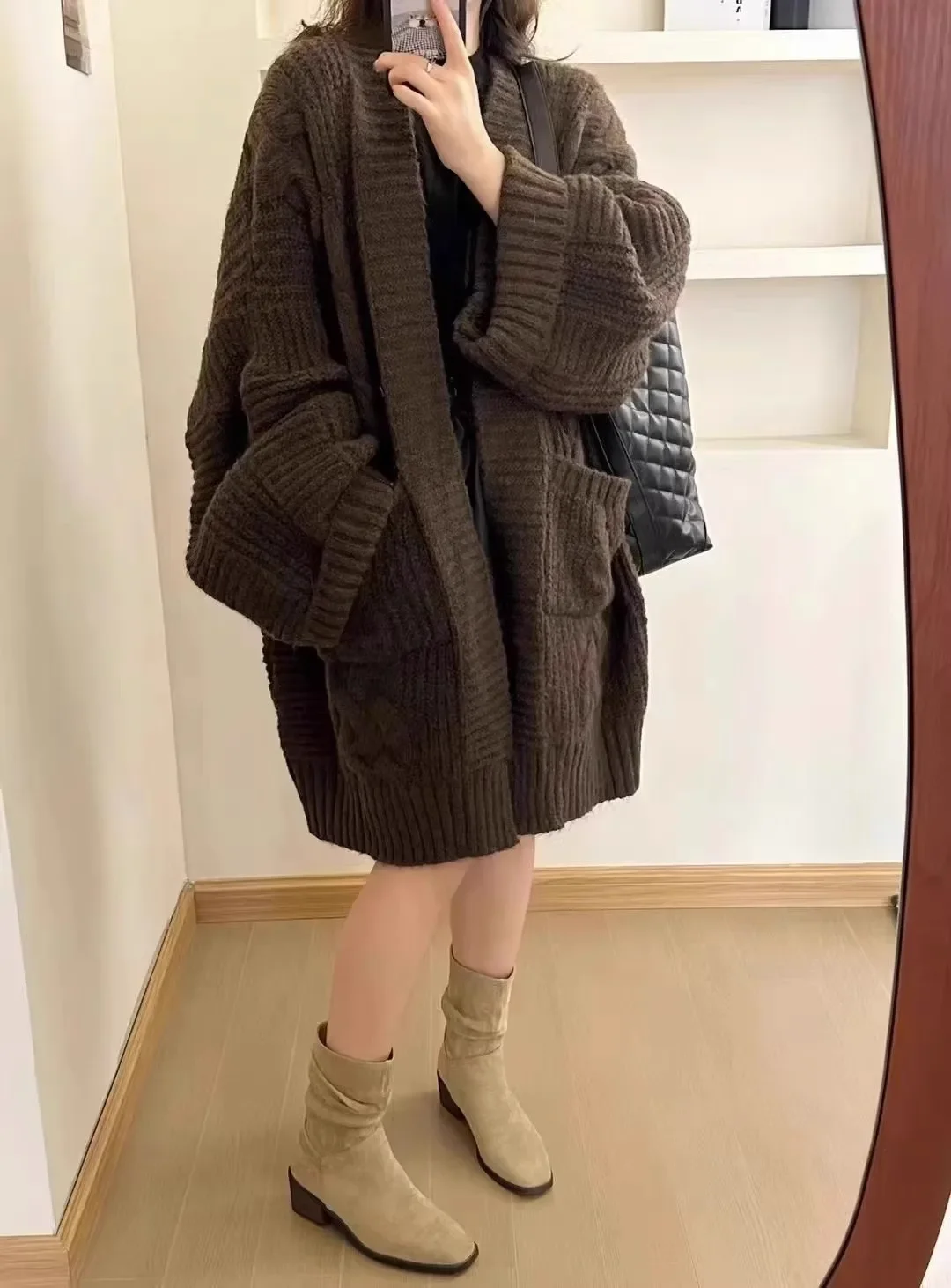 New Loose Women's Knitted Cardigan Casual Solid Color Sweater Medium Length Thick Elegant Loose Coat with Pockets