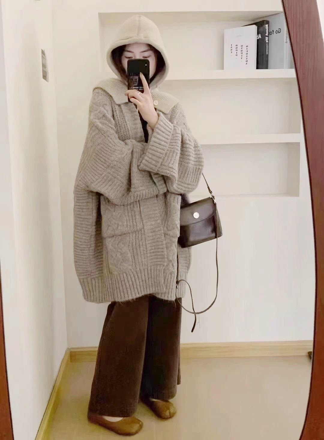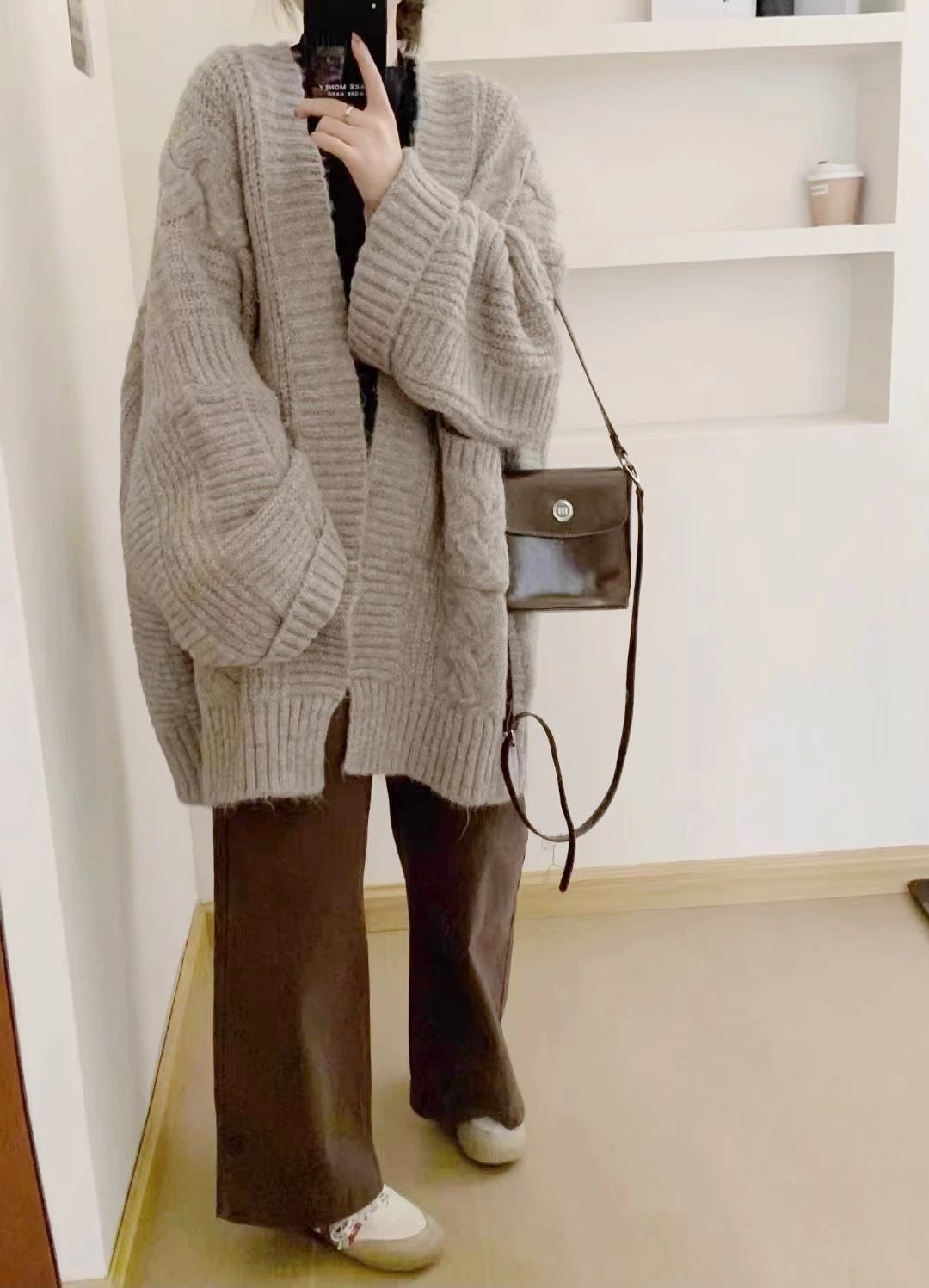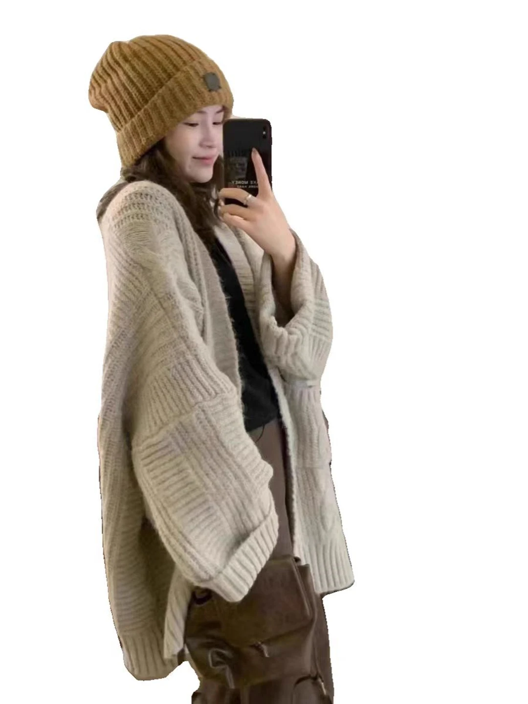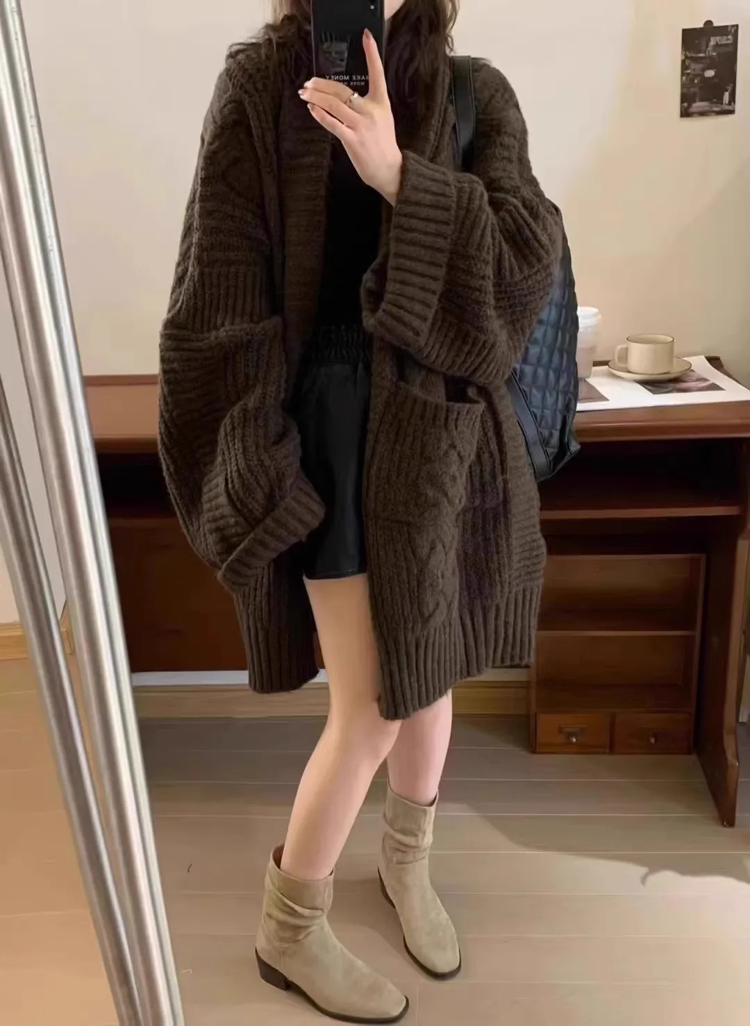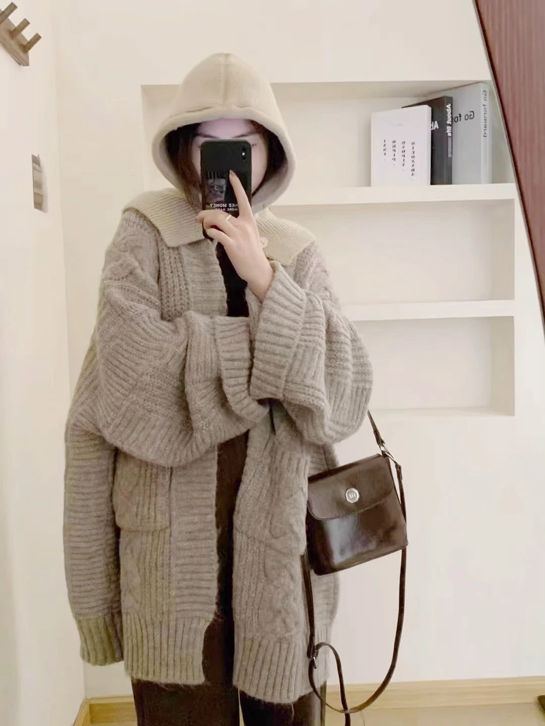 New Loose Women's Knitted Cardigan Casual Solid Color Sweater Medium Length Thick Elegant Loose Coat with Pockets