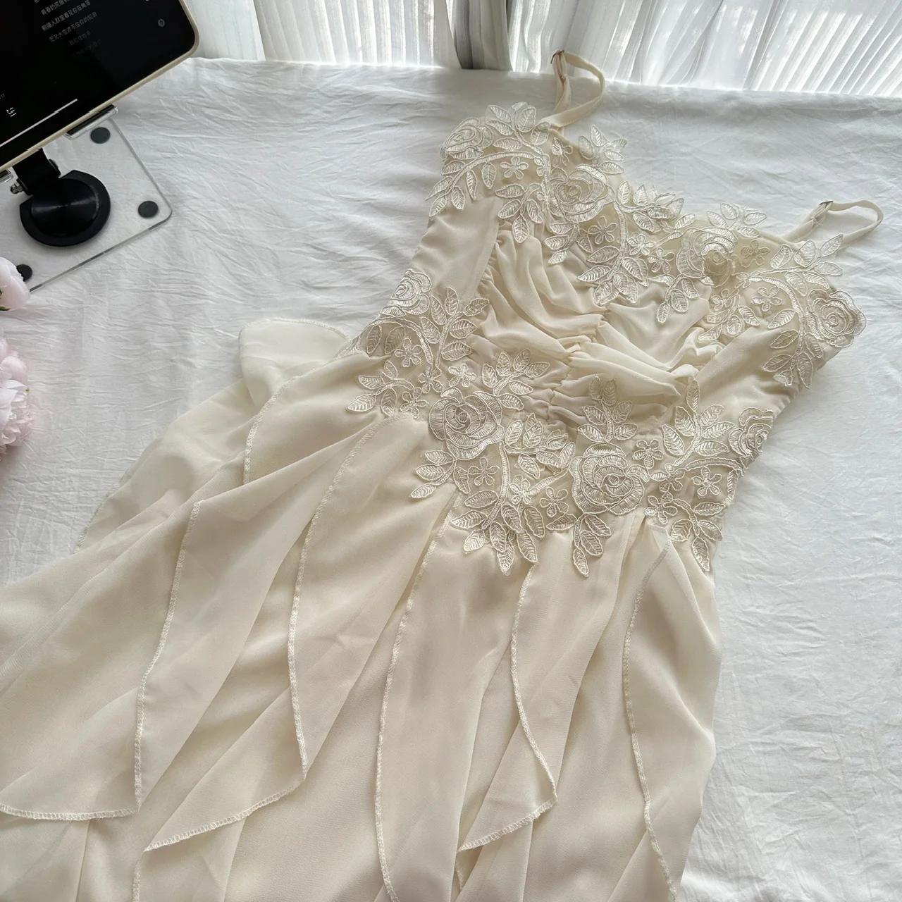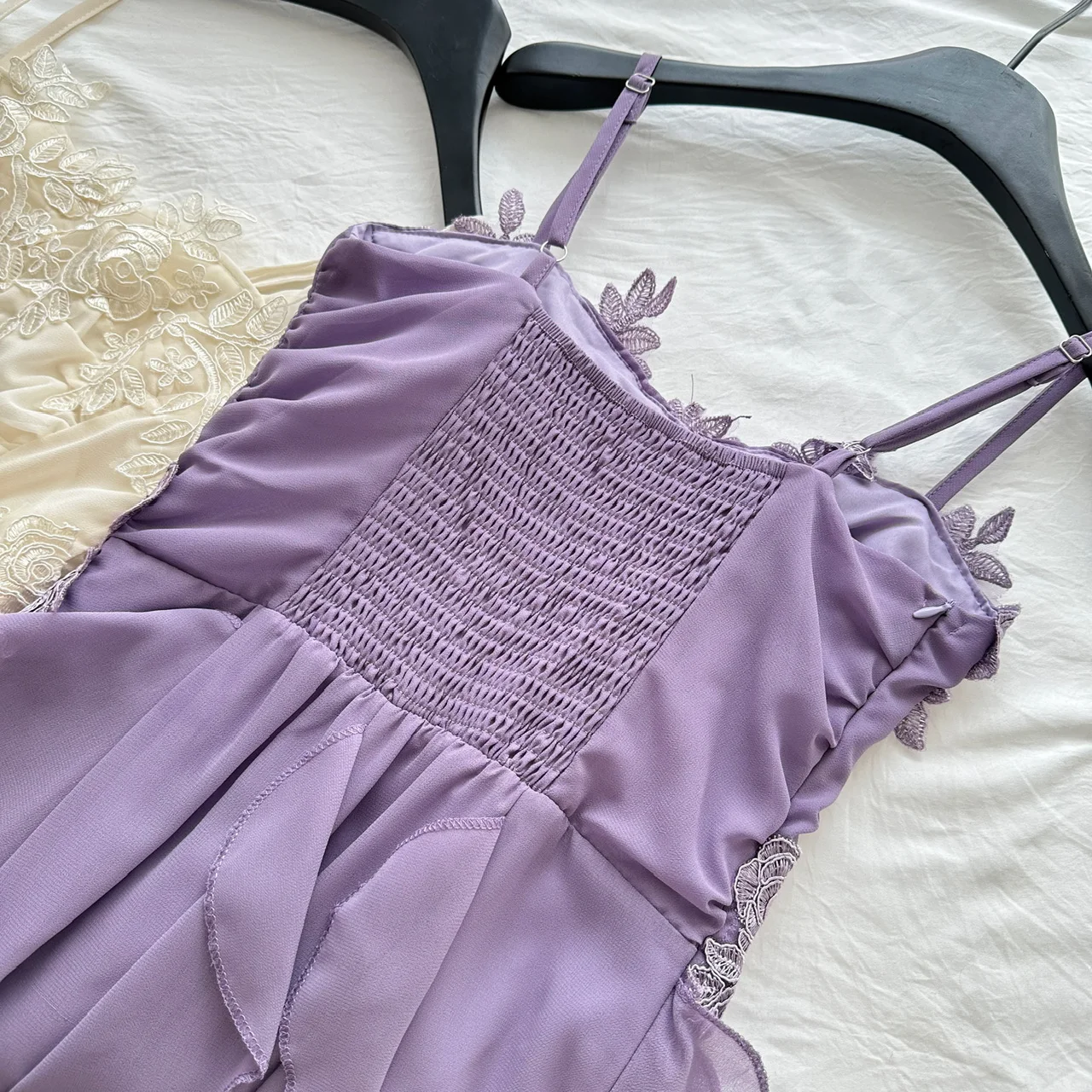 Summer French Vintage New Purple Elegant Slim Backless Party Dress Women Beige High Waist Sleeveless Ruffle Edge Slip Long Dress